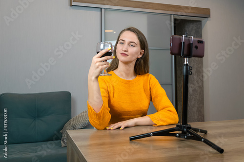 Young dark-haired female blogger in an orange sweatshirt with a glass of red wine sits in front of a tripod with a mobile phone in a stylish interior. Female wine blogger