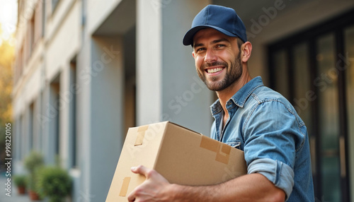Young European man courier holding cardboard box and smiling at camera, shipping and logistics concept, home delivery concept, delivery man