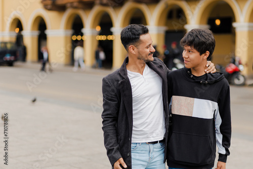 Young father and his son strolling through the city. Father's Day concept.......