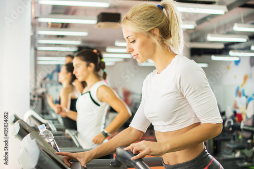 Young female athlete exercising on treadmill in a gym. She is setting up difficulty level on gym machine.