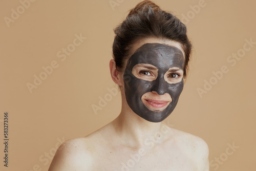 young female with cosmetic mask against beige background