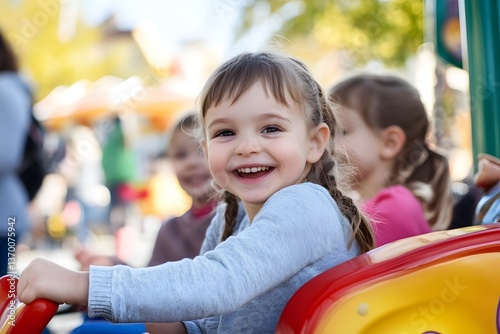 Young girl smiles joyfully with friends at a playground merry-go-round