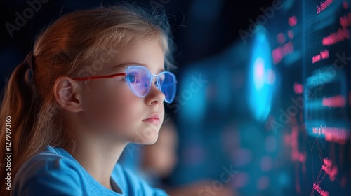Young girl wearing blue glasses focused on coding at a computer in a dark environment with glowing screens