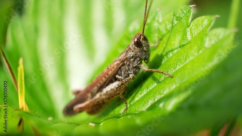 Young grasshoppers are eating plants. green grasshopper. insect