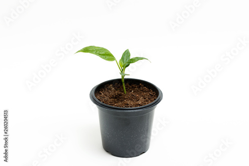 Young green plant grows in a pot for seedlings, isolated on a white background. Sprout pepper.