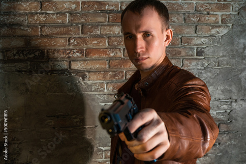 young guy with gun in leather jacket