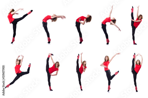 Young gymnast exercising on white