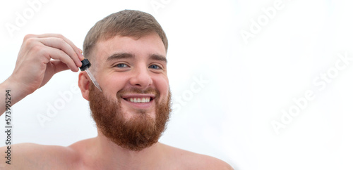 young handsome bearded man apply serum oil, cosmetic product, lotion for healthy perfect fresh skin hydration, grow beard, using skincare, hydrating on white background