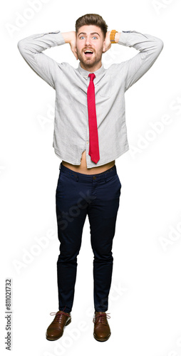 Young handsome business man Crazy and scared with hands on head, afraid and surprised of shock with open mouth