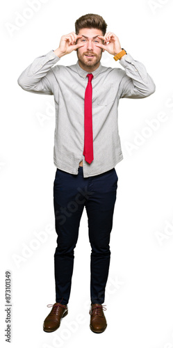 Young handsome business man Trying to open eyes with fingers, sleepy and tired for morning fatigue