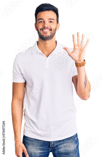 Young handsome hispanic man wearing casual clothes showing and pointing up with fingers number five while smiling confident and happy.