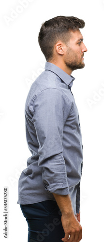 Young handsome man over isolated background looking to side, relax profile pose with natural face with confident smile.