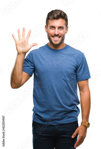 Young handsome man over isolated background showing and pointing up with fingers number five while smiling confident and happy.