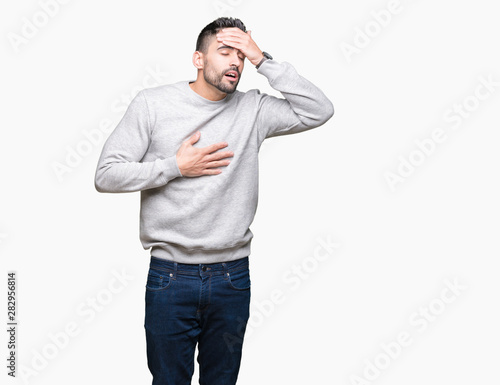 Young handsome man wearing sweatshirt over isolated background Touching forehead for illness and fever, flu and cold, virus sick