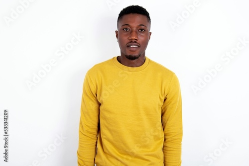 young handsome man wearing yellow sweater over white background with nice beaming smile pleased expression. Positive emotions concept