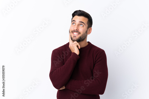 Young handsome man with beard over isolated white background thinking an idea while looking up