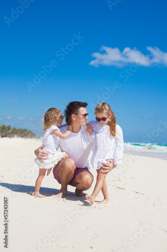 Young happy father and cute daughters having fun on white beach
