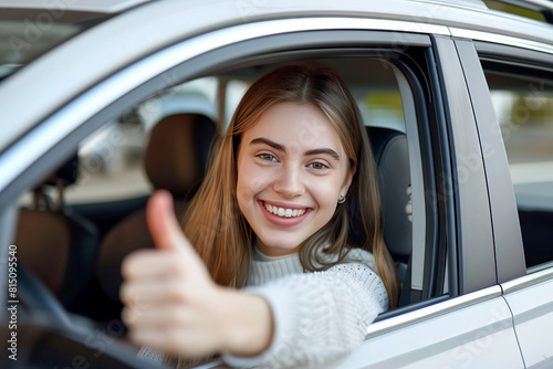 Young happy Woman Giving Thumbs Up at camera Sitting in the Driver's Seat in a Car Having Just Obtained a Driver's License