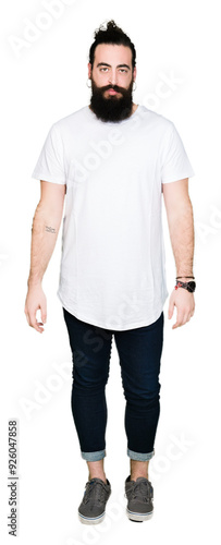 Young hipster man with long hair and beard wearing casual white t-shirt depressed and worry for distress, crying angry and afraid. Sad expression.