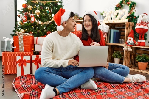 Young hispanic couple smiling happy wearing christmas hat. Sitting on the floor using laptop at home.
