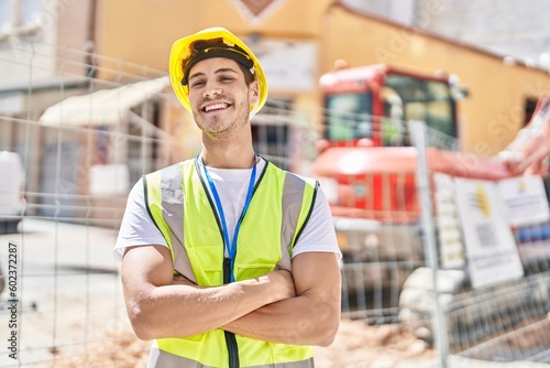 Young hispanic man architect smiling confident standing with arms crossed gesture at park