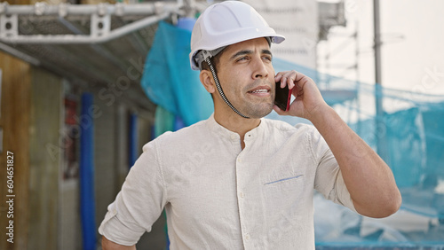 Young hispanic man architect talking on smartphone at street