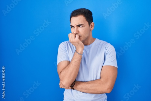 Young hispanic man standing over blue background looking stressed and nervous with hands on mouth biting nails. anxiety problem.