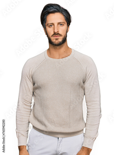Young hispanic man wearing casual clothes with serious expression on face. simple and natural looking at the camera.