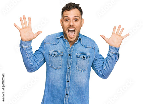 Young hispanic man wearing casual denim jacket celebrating crazy and amazed for success with arms raised and open eyes screaming excited. winner concept
