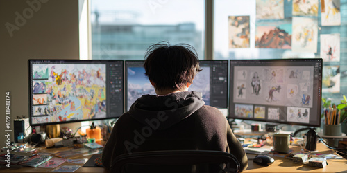 Young illustrator working from home sitting in front of three monitors displaying graphic design software and illustrations, illuminated by natural light
