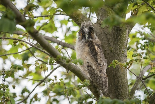 Young long-eared owl (Asio otus) sitting on branch, young animal, Lake Neusiedl, Burgenland, Austria, Europe