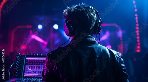 Young male DJ in leather black jacket plying music with neon light effect on stage, back view .