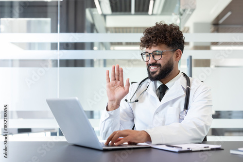 Young male doctor in a white coat and stethoscope smiling and waving during a virtual medical appointment or healthcare video call, on a laptop in a clinic office