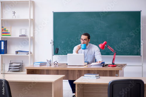 Young male teacher in front of green board