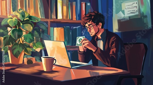 Young Man Enjoying Coffee Break at Laptop in a Quiet Library