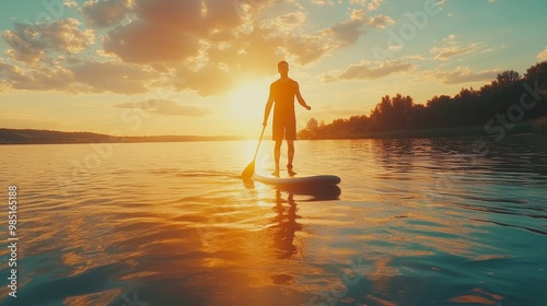 Young man enjoys sunset paddleboarding in tranquil waters, embracing nature s beauty