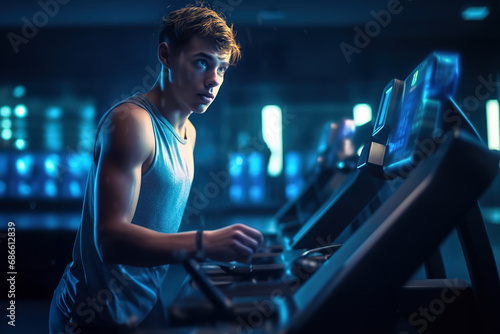 Young man in sportswear running on treadmill at gym. Late male teenager running on treadmill.
