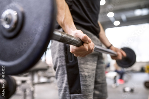 Young man lifting weights in gym