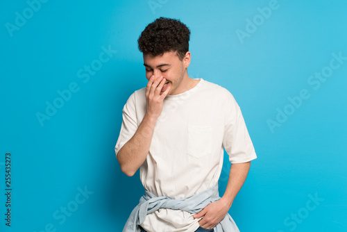 Young man over blue background posing with arms at hip and laughing