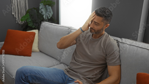 Young man sitting indoors holding his head with a headache in a modern living room, expressing discomfort and pain, showcasing a hispanic adult in a home environment.