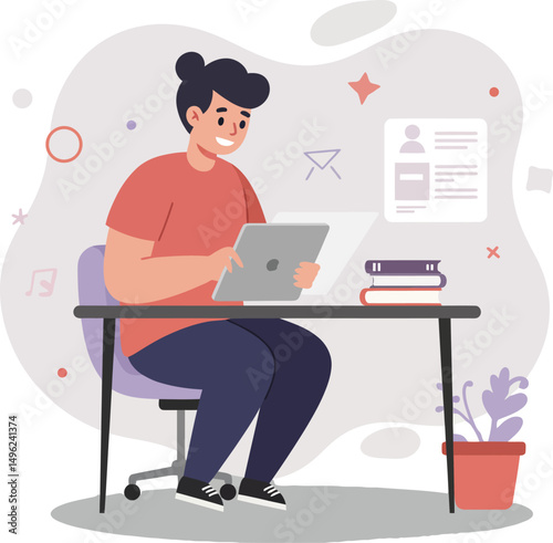 Young man using tablet at desk with books and plant in modern workspace vector illustration