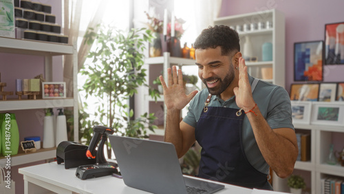 Young man with hands raised celebrating in a home decor store, wearing an apron and standing behind a counter with a laptop and scanner, surrounded by various decorative items and plants