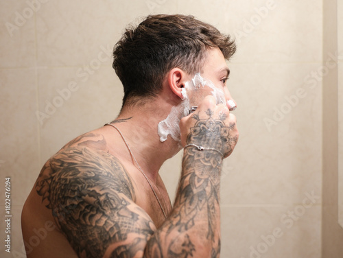 Young man with tattooed arms shaving in the bathroom. He applies shaving foam to his face and uses a razor while looking into the mirror, capturing a personal grooming and self-care moment
