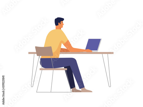 Young man working on the computer programmer, business analysis, design, strategy. Vector illustration.