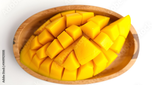 Young mango kickshaw, made from thinly sliced tangy yellow mango, placed on a wooden dish, photographed with a white background.