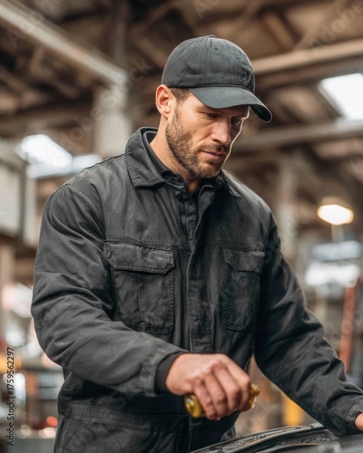 Young mechanic checks oil level in vehicle at auto shop during daytime showcasing expertise and attention to detail in his work environment