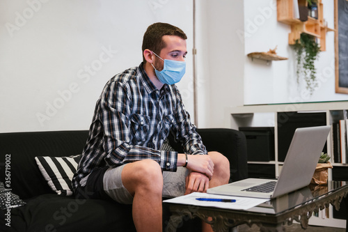 Young millennial man with shirt and shorts and medical mask in a video call conference at laptop on the sofa with his bosses of work at distance for avoid contamination from Coronavirus, Covid-19