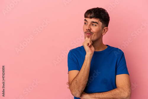 Young mixed race man isolated on pink background relaxed thinking about something looking at a copy space.