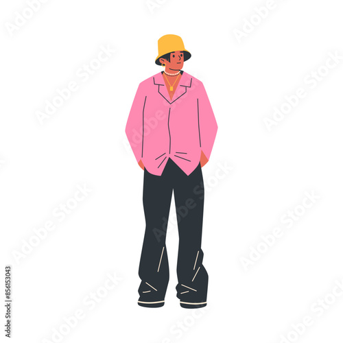 Young person vector Y2K fashion, glamour POP 00s stylish teenager clothes, pink shirt, wide trousers, panama hat jewelry