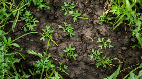 Young plants sprouting in dark soil